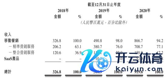 在三年前,2018年-2020年,公司卓绝94%的收入来自迁移营销,即精确营销办事和整合作销收入,前者占总收入的63%-78%之间,后者占比从2018年的36.9%着落至2020年的17.2%。SaaS居品孝顺了东信营销科技剩余的收入。