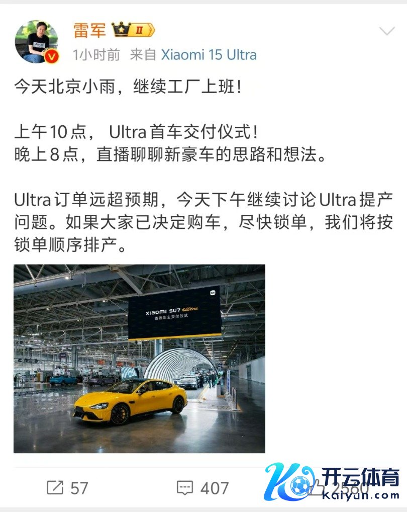 与此同期,雷军还清晰小米SU7 Ultra的订单远超预期,今宇宙午将连续盘考提产问题。