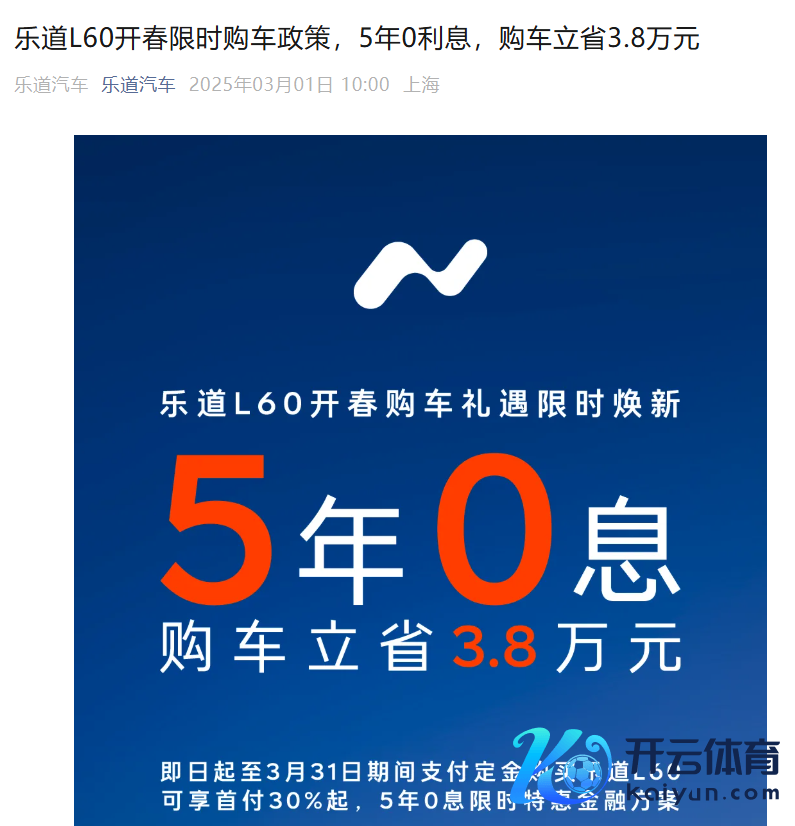 蔚来第二品牌乐说念在2月推出了“5年0息”的限时购车计谋。当今晓示消耗者在3月支付定金购买乐说念L60,可享“首付30%起,5年0息”的限时特惠金融决策。