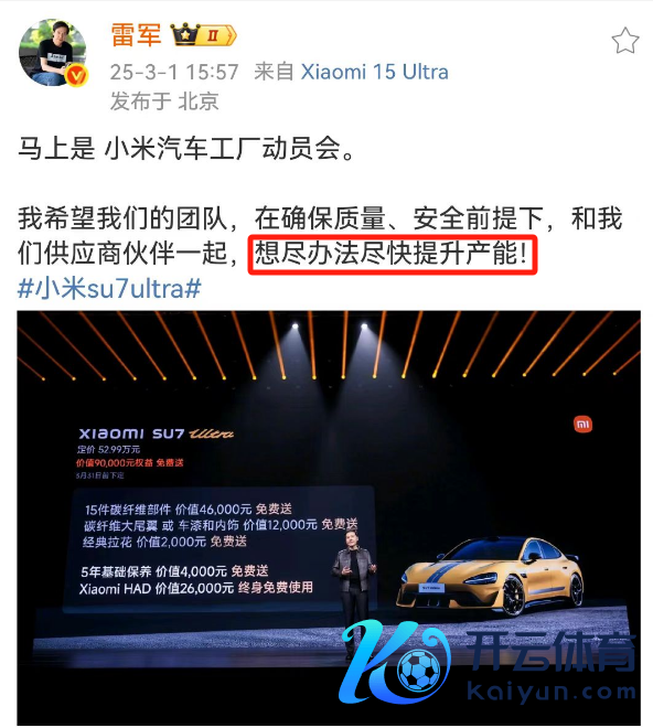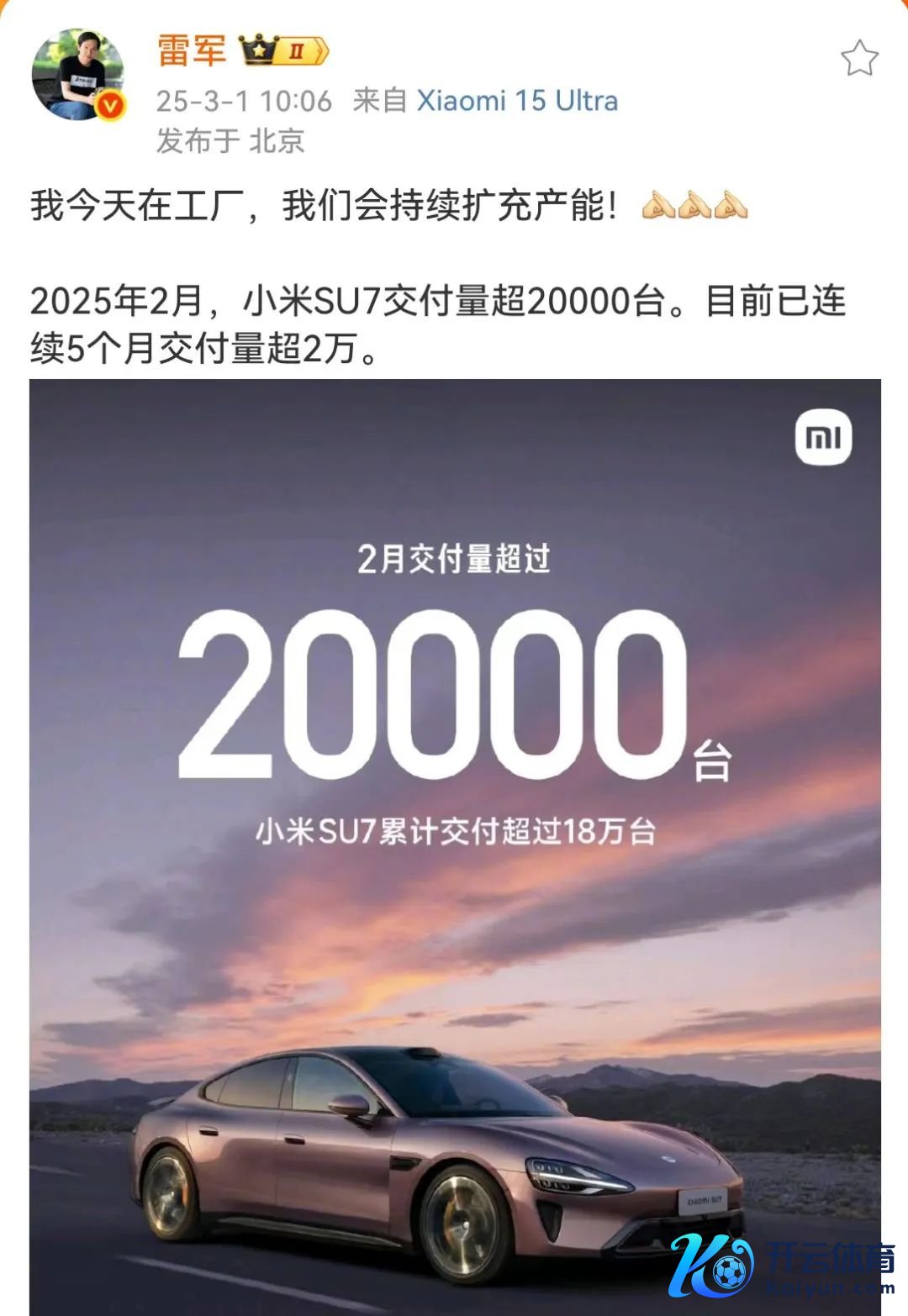 以小米汽车为例,其2月委派量超2万辆。3月1日,小米创办东说念主、董事长兼CEO雷军发布微博称:“我今天在工场,咱们会抓续履行产能!”