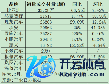 小鹏汽车、零跑汽车、理思汽车在本年2月的委派量同比阔别增长570%、285%、29.69%。