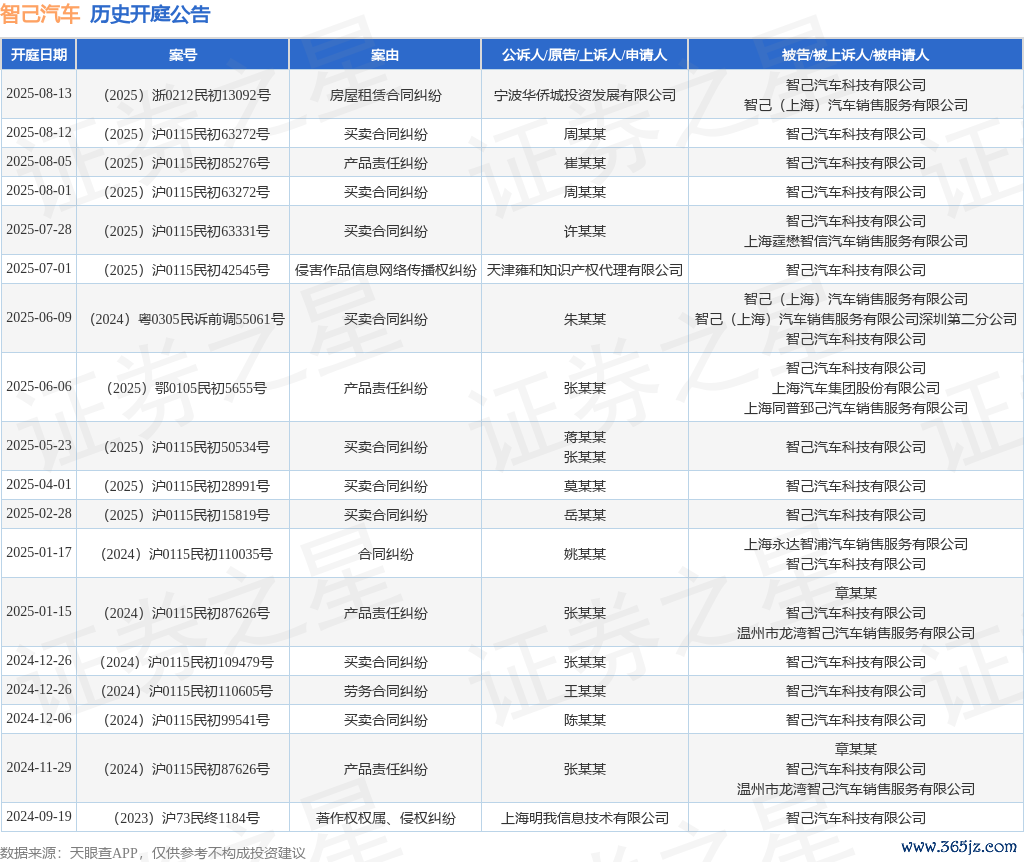 案号:(2025)沪0115民初63272号审理法院:上海市浦东新区东谈主民法院案由:生意契约纠纷当事东谈主信息: 原告/上诉东谈主:周某某 被告/被上诉东谈主:智己汽车科技有限公司开庭日历:2025年8月12日笔据统计,近一年内以智己汽车科技有限公司为当事东谈主的历史开庭公告有18则,其中案由为“生意契约纠纷”的公告以9则居首,其次为“家具职守纠纷”有4则,“侵害作品信息集聚传播权纠纷”有1则。历史开庭公告如下: