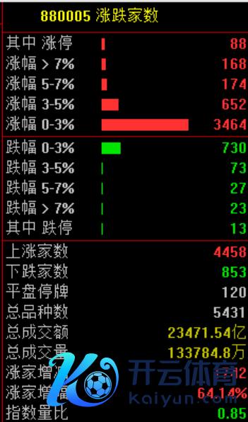 全商场共4458只个股高潮,88只个股涨停,853只个股下落。